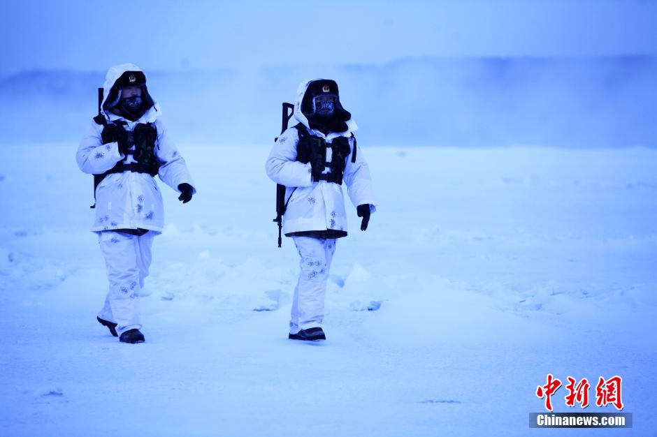 2014年12月10日,“黑河好八连”哨兵辛国强和张波冒着零下32度高寒气温在中俄界江黑龙江上巡逻执勤。中新社发 魏建顺 摄 图片来源:CNSPHOTO