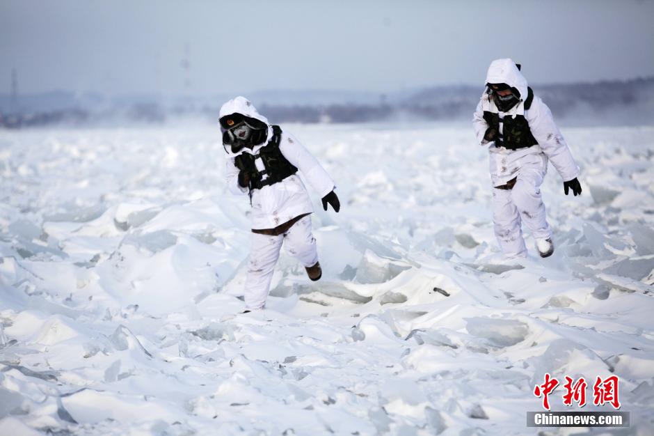 2014年12月10日,“黑河好八连”哨兵辛国强和张波冒着零下32度高寒气温在中俄界江黑龙江上巡逻执勤。中新社发 魏建顺 摄 图片来源:CNSPHOTO