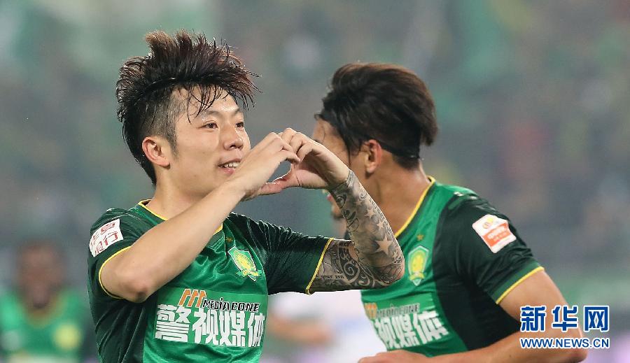 12月11日晚,北京国安与德甲沃尔夫斯堡签订转会协议,张稀哲正式登陆德甲。图为2014年3月24日,北京国安队球员张稀哲(左)在中超第三轮对阵上海绿地申花的比赛中庆祝进球。 新华社记者曹灿摄