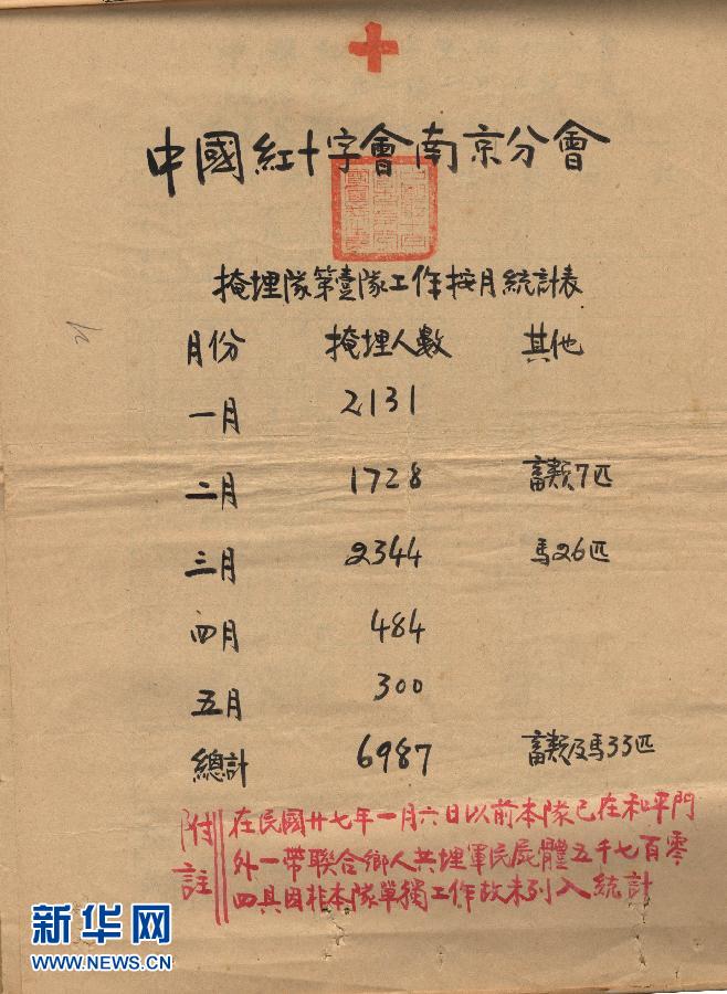 这是中国红十字会南京分会第一工作队的埋尸统计表。据该统计表显示,第一工作队自1938年1月6日后至5月31日期间共掩埋尸体6987具。 12月11日,国家档案局在其官方网站发布七集网络视频《南京大屠杀档案选萃》的第五集《慈善机关埋尸记录与被害者坟冢照片》。《慈善机关埋尸记录与被害者坟冢照片》展示了由南京市档案馆收藏的中国红十字会南京分会埋尸记录、南京大屠杀被害者埋藏地址摄影、南京慈善机关暨市民鲁甦报告敌人大屠杀概况统计表等。这些资料中的数字以及照片中的垄垄坟丘,记载了当年日军南京大屠杀的累累罪行。新华社发