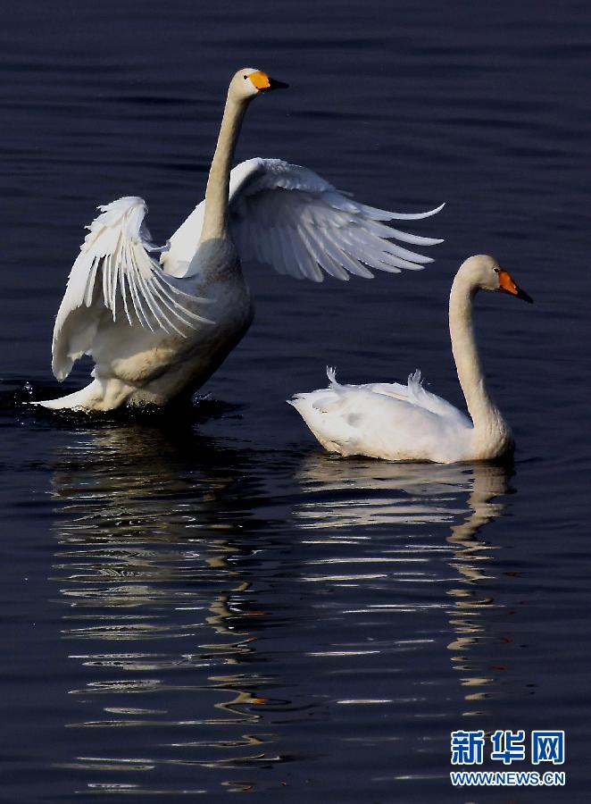 12月14日,两只白天鹅在湖面上嬉戏。新华社记者 王颂 摄