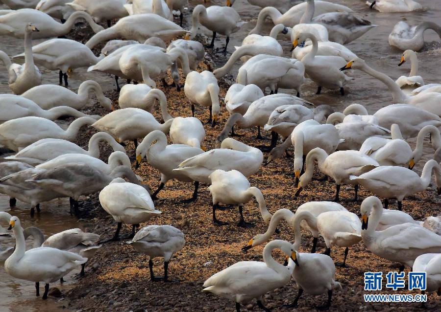 12月14日,白天鹅在洒满玉米粒的滩涂上吃食。新华社记者 王颂 摄