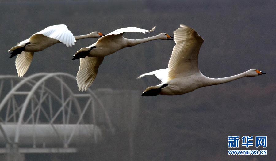 12月14日,三只白天鹅从三门峡市内的一座桥梁前飞过。新华社记者 王颂 摄