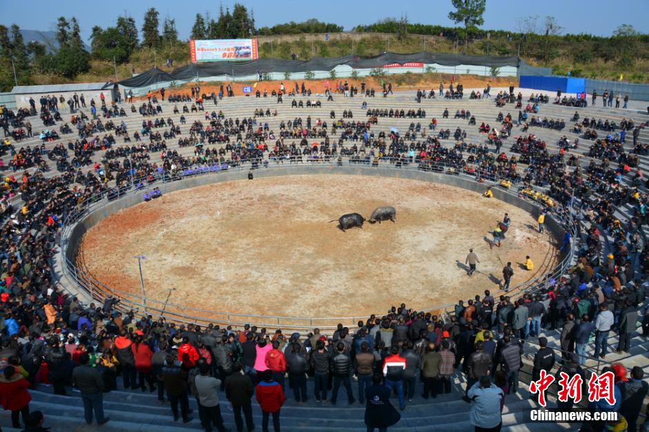 12月12日,湖南省靖州苗族侗族自治县举办首届“省际牛王争霸赛”,来自云南、广西、湖南、贵州四省区的84头“牛魔王”轮番登场,上演了一场精彩的斗牛民俗大餐,吸引了湘黔桂周边近万名群众前来观战。刘杰华 摄