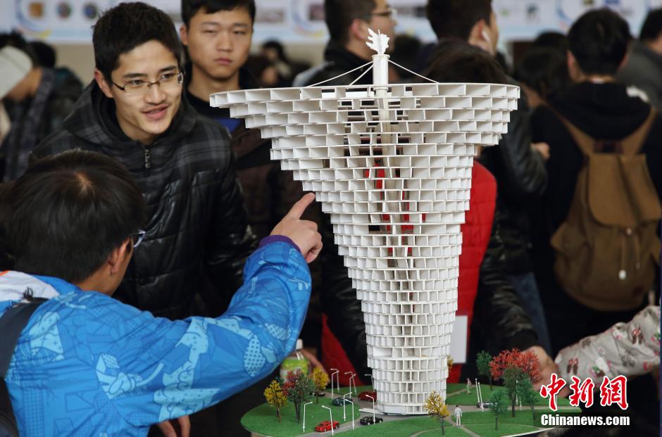 12月14日,大学生们被展出的“龙卷风大厦”模型吸引,该大厦采用核心筒和交错剪力墙机构,具有较强的抵抗力。当日,以“创意点亮生活,创新引领未来,创业成就梦想”为主题的南京航空航天大学校园科技文化节在将军路校区举行,会写字的机器人、全时四轮驱动医疗机器人、X型飞行器、四旋翼等大学生科技作品集中亮相,同时举办体验飞行、科技撞地球等易操作的科普项目供市民学生参与体验。中新社发 泱波 摄