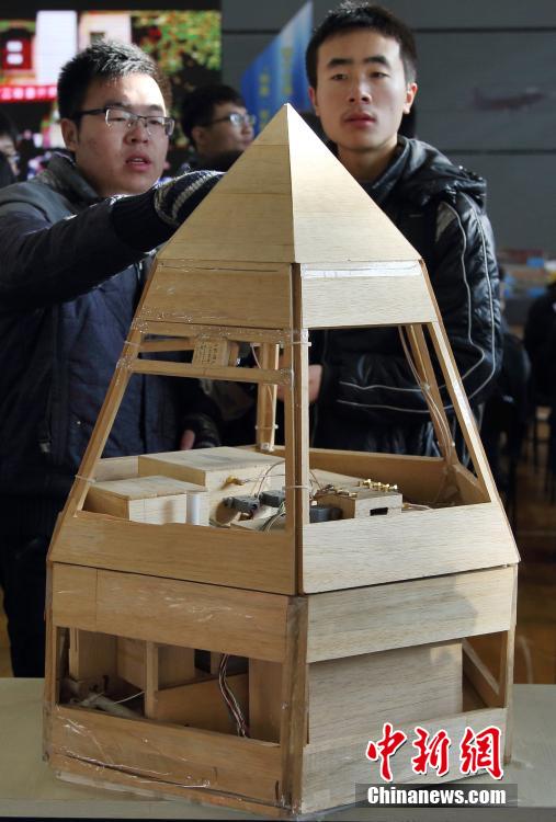 12月14日,大学生们被展出的“天巡一号卫星”木制结构模型吸引,2011年11月9日,“天巡一号”卫星伴着“遥感卫星十二号”,被“长征四号乙”运载火箭成功送入太空用于空间技术验证。当日,以“创意点亮生活,创新引领未来,创业成就梦想”为主题的南京航空航天大学校园科技文化节在将军路校区举行,会写字的机器人、全时四轮驱动医疗机器人、X型飞行器、四旋翼等大学生科技作品集中亮相,同时举办体验飞行、科技撞地球等易操作的科普项目供市民学生参与体验。中新社发 泱波 摄