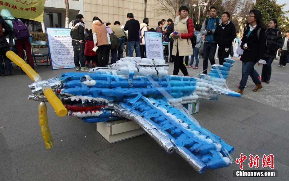 12月14日,大学生们被展出的用废旧瓶子等物品搭建成的飞机吸引。当日,以“创意点亮生活,创新引领未来,创业成就梦想”为主题的南京航空航天大学校园科技文化节在将军路校区举行,会写字的机器人、全时四轮驱动医疗机器人、X型飞行器、四旋翼等大学生科技作品集中亮相,同时举办体验飞行、科技撞地球等易操作的科普项目供市民学生参与体验。中新社发 泱波 摄