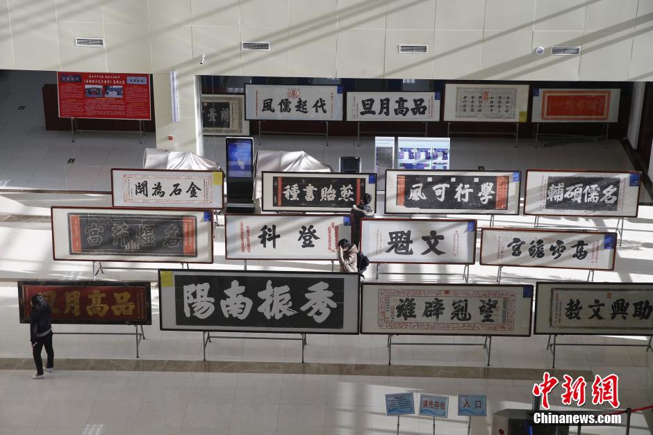 12月15日,观众观看匾额拓片展板。当日,匾额拓片北京高校巡展来到北京电子科技职业学院图书馆,展品均来自北京科举匾额博物馆。作为集书法篆刻和建筑艺术为一体的文化形式,匾额是当下人们了解中华文化的重要实物例证,学生们在感受中华书法艺术魅力的同时,可以得到来自真正传统文化的陶冶和熏陶。中新社发 张浩 摄