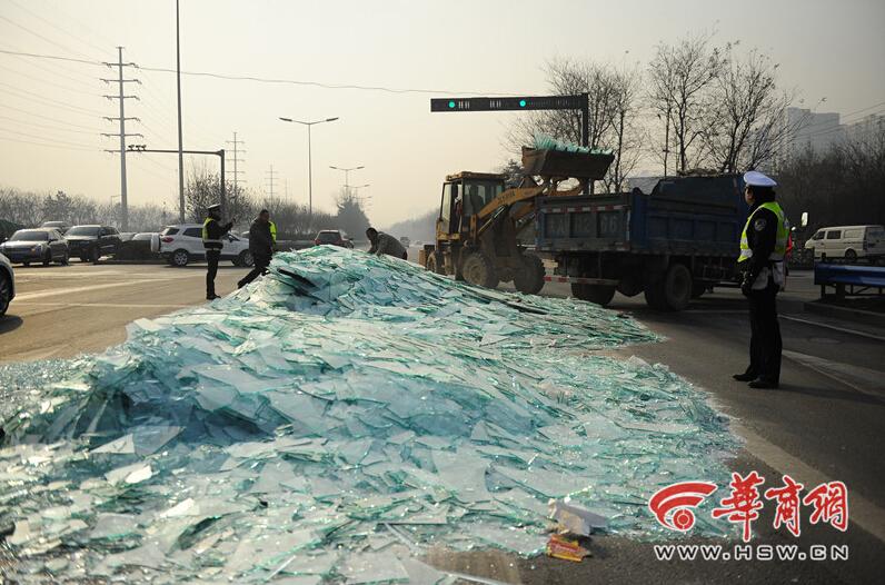 12月15日上午11时许,一辆小型装载机来到现场清理碎玻璃。一位保洁员表示,估计要三车才能拉完。交警说,属单方事故,未造成人员伤亡。来源:华商网