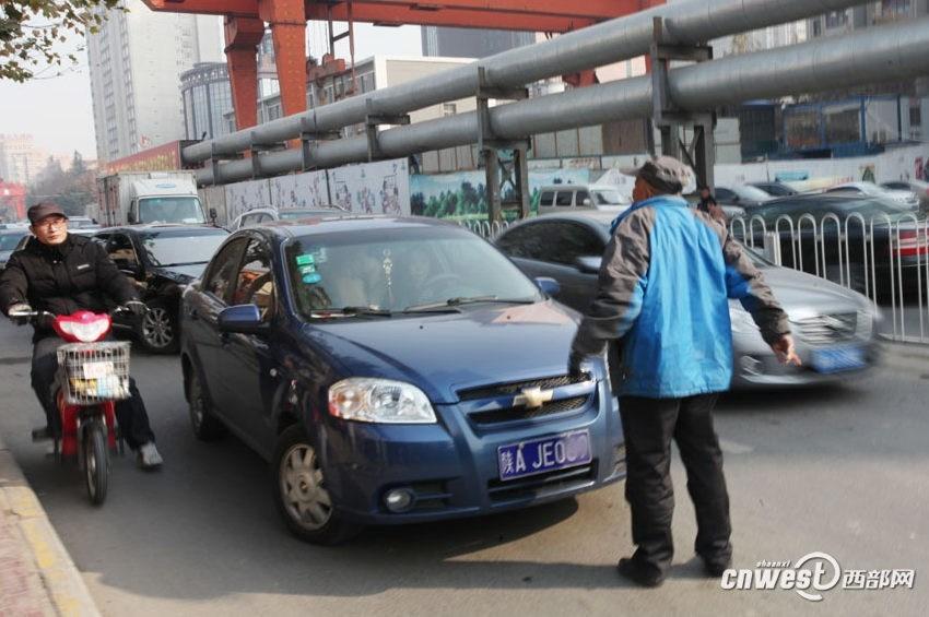 12月15日中午,西安西影路,一男子强行拦挡过往车辆索要钱财,造成交通堵塞。图片来源:西部网