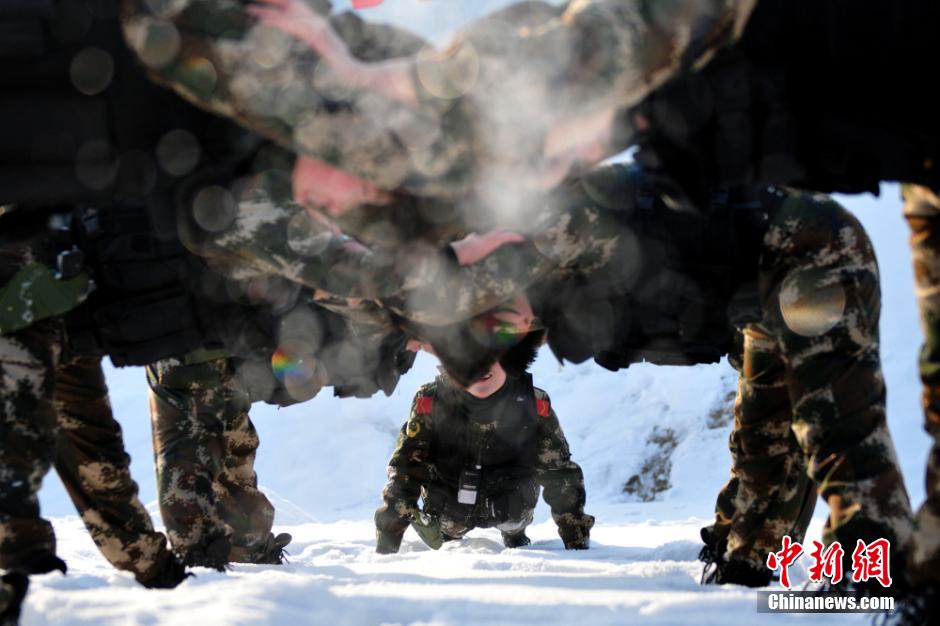 12月25日,驻扎在新疆昌吉市被喻为“天山女侠”的新疆公安边防总队训练基地女子特勤分队针对冬季季节特点,坚持以老带新,不断加强训练强度,科学组织开展擒敌、战术、体能、射击和抗寒适应性训练为主的训练内容,掀起冬季练兵热潮。据悉,该女子特勤分队队员均经过严格选拔,具有较好的身体素质、较高的文化水平,较突出的个人特长,经过长时间的特战训练,将担负维护社会安全稳定的重要使命。范昕羽 摄