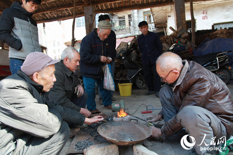12月13日,顾客拿着旧铁锅找补锅匠全德棣补锅。王滋创 摄