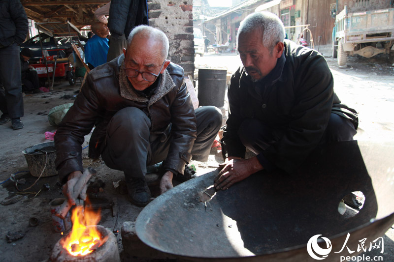 12月13日,补锅匠全德棣(左)和徒弟杜述荣在修补一只旧铁锅。王滋创 摄
