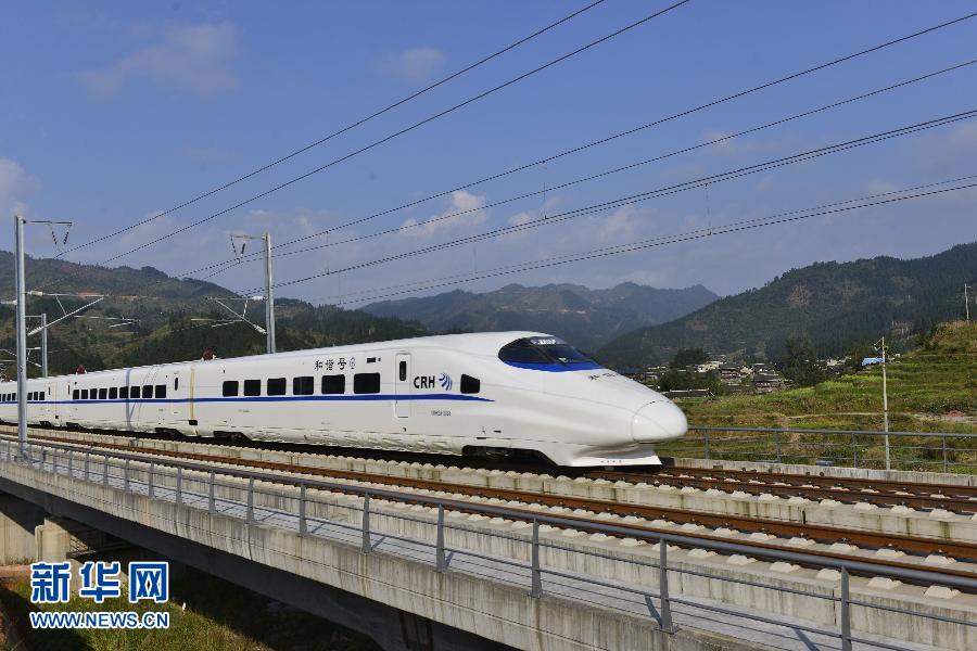 11月29日,和谐号动车组从贵广高铁贵州段榕江县境内驶过。晨尝广州虾饺鲜,午游桂林漓江美,夜宿贵州吊脚楼……从12月26日开始,各路小伙伴即可搭乘动车奔跑起来,在一日之内尽览南中国的多样风情。虽然贵广高铁、南广高铁有着一个霸气的称号——“穿越喀斯特的超级铁路”,但带你体验的却是南中国“最温柔的风景线”。浓浓的粤味文化,写意的桂派山水,神秘的黔乡风情……小伙伴们,赶紧来瞧瞧“高大上”的黄金旅游高铁带来的福利吧。新华社发