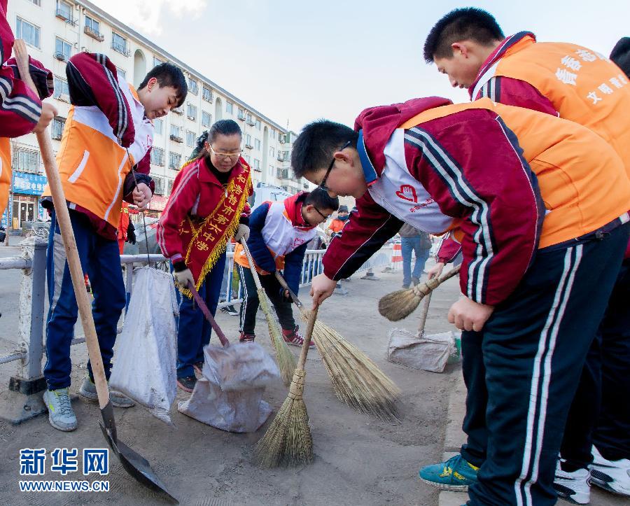 12月25日,青年志愿者和团员在清扫路面,体验环卫工人的辛劳。当日,内蒙古呼和浩特市玉泉区团委组织青年志愿者和团员来到该区六中前街体验保洁生活。志愿者和团员在保洁员的带领下清扫社区路面,“换位”体验环卫工人严寒下的工作辛劳。新华社发(丁根厚 摄)