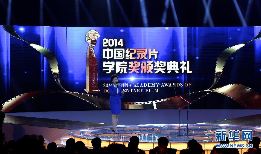 12月26日,主持人在2014中国纪录片学院奖颁奖典礼上介绍奖项情况。当日,2014中国纪录片学院奖颁奖典礼在北京中国传媒大学举行。今年共有近200部作品入围学院奖评选,竞逐16个奖项,其中最佳网络纪录片、系列纪录片、最佳纪录电影奖是今年首次设立的三个奖项。新华社记者高静摄