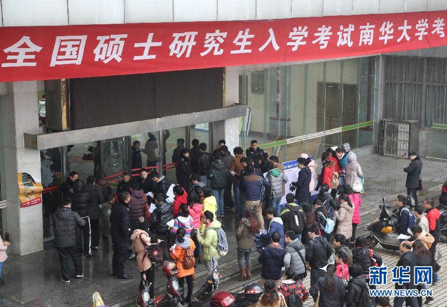 12月27日,考生步入湖南衡阳南华大学考点。当日,2015年全国硕士研究生招生考试正式开考。据教育部公布的数据估计,2015考研报考总人数为164.9万,比去年减少6.5万,降幅3.8%,考研报名人数连续两年下跌。新华社发(曹正平 摄)