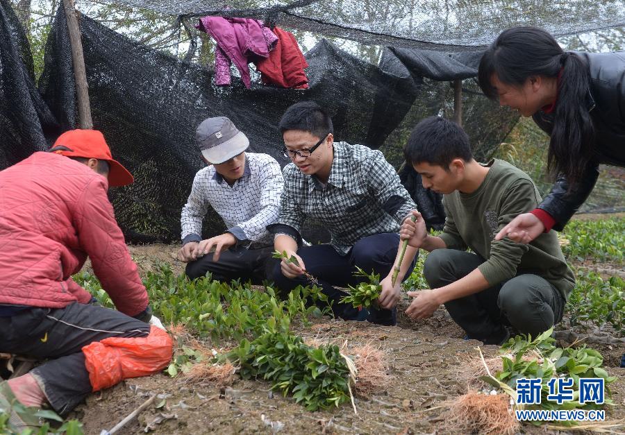 青年学员秦钰杰(左三)在湖北省大悟县河口镇田间体验茶树育苗(11月17日摄)。