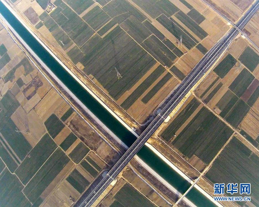 这是南水北调中线总干渠穿过河北邢衡高速公路(2014年12月19日摄)。南水北调中线一期工程于12月12日正式通水。连日来,汉江水从鄂豫交界的丹江口水库一路北上,跨越了1000多座桥梁、200多条河流,经过近半个月的旅程,预计于12月27日流至北京。北京市南水北调办25日表示,北京已制定2015年用水计划,通水首年计划调水量为8.18亿立方米。新华社航拍小组摄