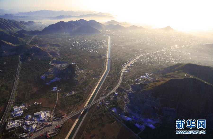 这是南水北调中线总干渠在河北保定与高速公路交叉(2013年5月30日摄)。南水北调中线一期工程于12月12日正式通水。连日来,汉江水从鄂豫交界的丹江口水库一路北上,跨越了1000多座桥梁、200多条河流,经过近半个月的旅程,预计于12月27日流至北京。北京市南水北调办25日表示,北京已制定2015年用水计划,通水首年计划调水量为8.18亿立方米。新华社发(南水北调宣传中心供图)