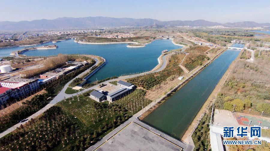 这是南水北调中线北京段总干渠团城湖调节池(左上)和团城湖明渠(右下)(11月14日摄)。南水北调中线一期工程于12月12日正式通水。连日来,汉江水从鄂豫交界的丹江口水库一路北上,跨越了1000多座桥梁、200多条河流,经过近半个月的旅程,预计于12月27日流至北京。北京市南水北调办25日表示,北京已制定2015年用水计划,通水首年计划调水量为8.18亿立方米。新华社记者邢广利摄