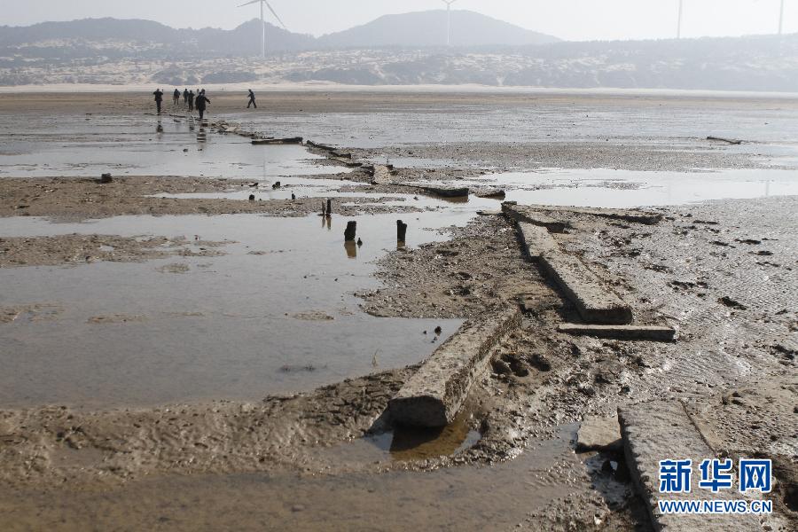 2014年12月30日,鄱阳湖中的明代石桥露出水面。随着我国第一大淡水湖鄱阳湖水位持续下降,逼近极枯水位,一座建造于明代的石桥露出水面。 新华社发(张俊 摄)