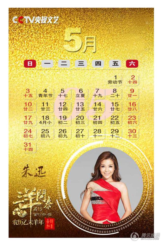 中央电视台央视文艺2015年挂历首度曝光。值得引人关注的是,今年春晚5位主持人从挂历选出,朱军和周涛位列第一、二月,董卿成“三月”美人。