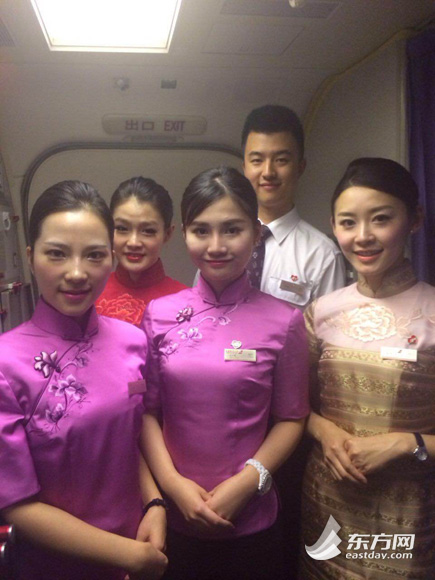 新年的第一个工作日,在上海飞往天津的航班上,东航的空姐们身着靓丽的唐装亮相,为乘客们送上新年的祝福。她们的笑容标志,自然上扬的嘴角,露出美丽的弧度。新年的第一班航程,空姐们用温馨周到的服务延续着“以客为尊,倾心服务”的理念。