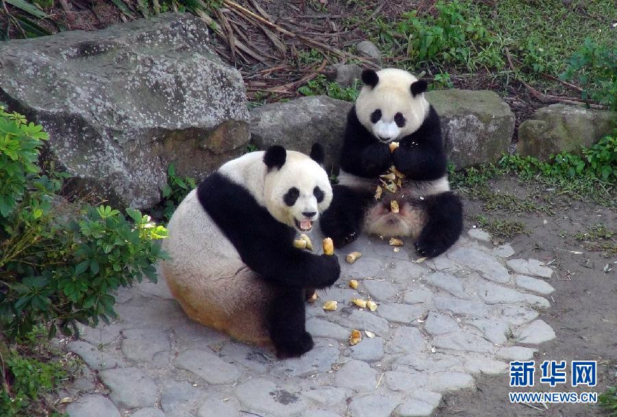 1月4日,台北市动物园的大熊猫“圆仔”(右)和妈妈“圆圆”在一起吃早餐。台北市动物园表示,从1月7日起,大熊猫“圆仔”将离开妈妈“圆圆”,正式开始独立生活。 新华社发