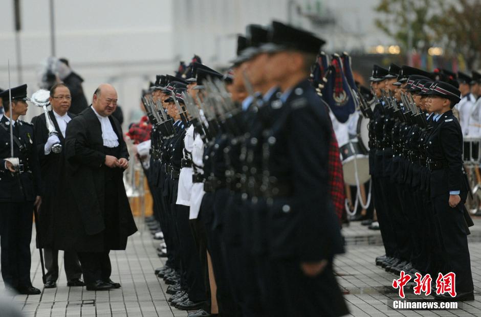 香港2015年法律年度开启典礼1月12日下午在中环大会堂举行。终审法院首席法官马道立在爱丁堡广场检阅香港警察仪仗队。中新社发 谭达明 摄