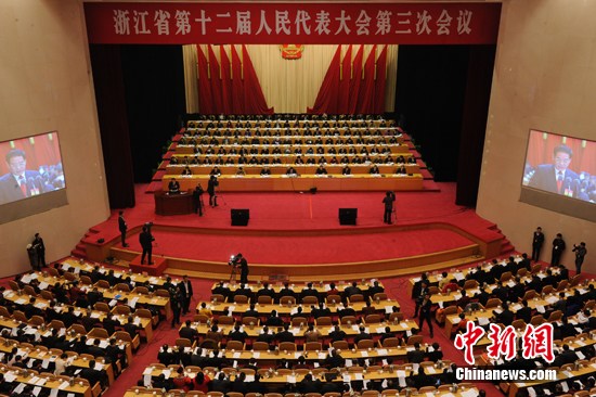 1月21日,浙江省第十二届人民代表大会三次会议开幕会在杭州举行,省长李强作政府工作报告,省人大常委会副主任王永昌作关于《浙江省社会养老服务促进条例(草案)》的说明。 中新社发 张茵 摄