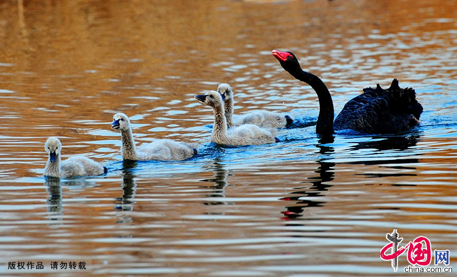 在北京圆明园遗址公园湖畔,4只小天鹅宝宝在父母的带领下,在寒冷的冰水中游弋,姿势有趣可爱。岸边众多游人拿起相机,争相拍摄天鹅“全家福”。 据专门看护天鹅的公园管理人员介绍,近日这四小只小家伙刚刚满月,每天都吸引许多游人及摄影爱好者拍摄。
