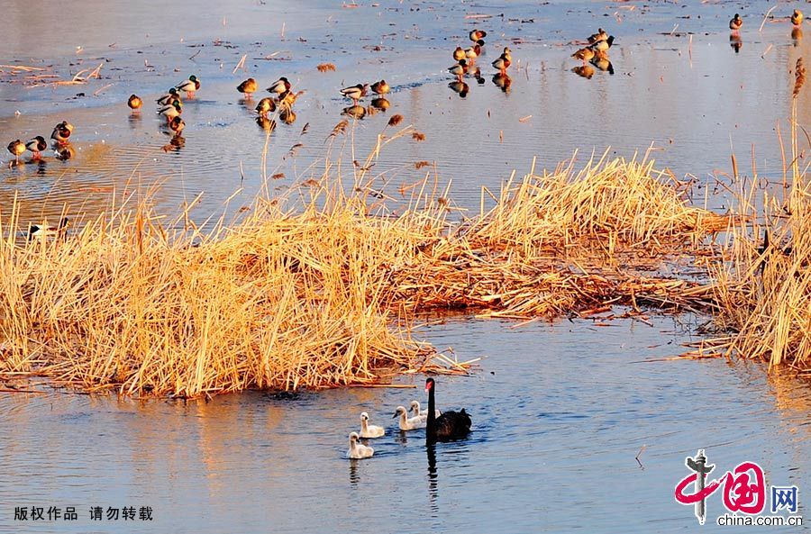 4只小天鹅宝宝在父母的带领下,在寒冷的冰水中游弋卖萌,姿势十分有趣可爱。中国网图片库 李文明/摄