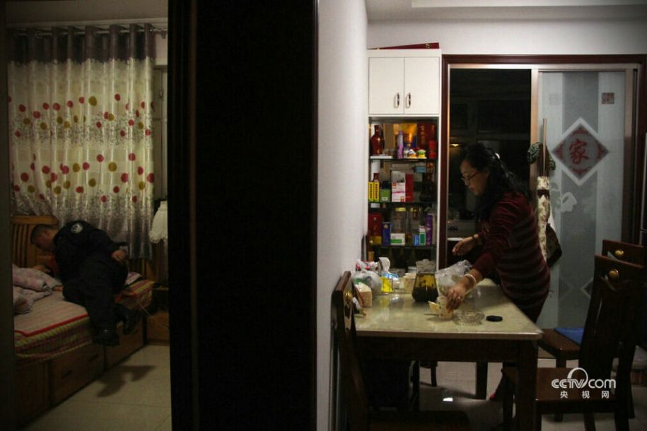 这次,包贺田是趁着夜巡开始前回家看看,并不能留宿。妻子一边问他吃过饭没,一边准备茶水,而包贺田在试图弄醒睡着的儿子。显然,小家伙并没有因为爸爸要回来而等他,晚上10点钟,已经深深入睡。