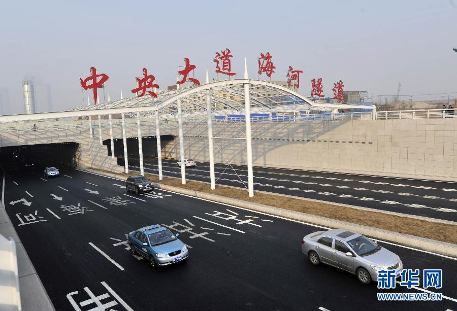 1月23日,车辆在隧道南口通行。当日,由天津滨海建投集团投资、中国铁建十八局集团承建的国内首座高震区水下沉管隧道——天津市滨海新区中央大道海河隧道试通车运行,海河南北两岸的车程由原来20多分钟缩短至3分钟,把中心商务区于家堡金融区与临港工业区、天津港散货物流区连为一体,为“京津冀一体化”注入强大的活力。连接海河北岸于家堡金融区和南岸东西沽地区的中央大道海河隧道于2008年11月3日开工建设,全长4.2公里,双向六车道,穿越海河地段采用沉管法施工工艺,每节沉管宽36.6米,高9.65米,长85米,重达3万吨,三节沉管总长255米,采用轴线干坞预制。这条隧道是国内首座高震区沉管隧道,抗震级别高达8级。新华社记者岳月伟摄