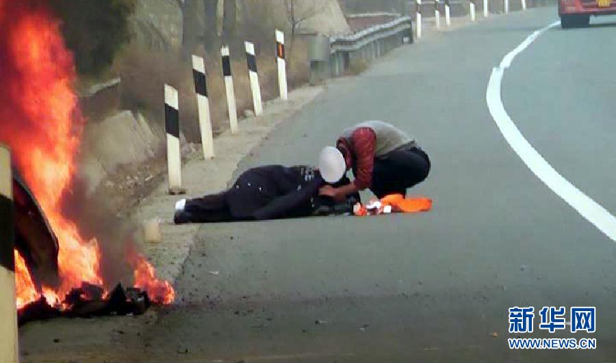 1月5日,青银高速汾阳段,一辆小轿车侧翻在路旁的排水沟里发生自燃。车后20多米处,一名伤者躺在冰冷的地面上,浑身颤抖。接警赶来的交警查看伤情后,将自己的棉大衣脱下盖在了伤者身上。