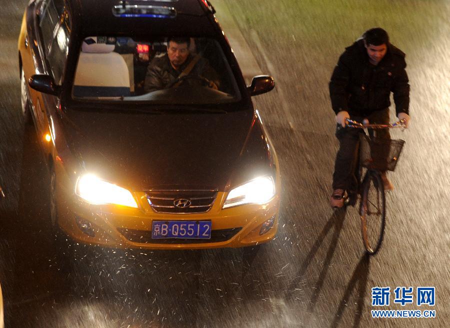 1月24日,一名行人在北京东三环辅路上骑行,细小的雪花在其身后的车灯照射下清晰可见。当日,一场降雪“光临”北京。北京市气象局官方微博“气象北京”发布消息称,16时前后开始,北京市自西向东先后出现小雪或零星小雪。截至20时,全市平均降雪0.3毫米。新华社记者 罗晓光 摄
