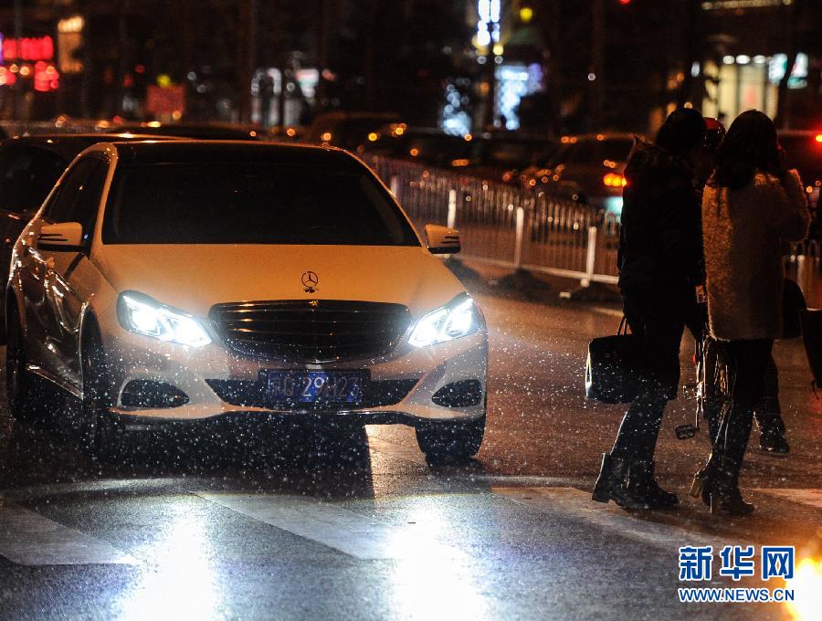 1月24日,几名行人在北京东三环附近一处斑马线等候过马路,细小的雪花在其身后的车灯照射下清晰可见。当日,一场降雪“光临”北京。北京市气象局官方微博“气象北京”发布消息称,16时前后开始,北京市自西向东先后出现小雪或零星小雪。截至20时,全市平均降雪0.3毫米。新华社记者 罗晓光 摄
