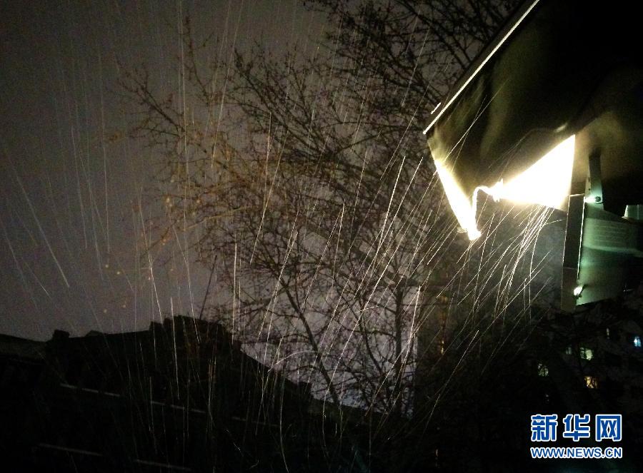 1月24日夜,雪花在北京城区飘落(手机拍摄)。当日,一场降雪“光临”北京。北京市气象局官方微博“气象北京”发布消息称,16时前后开始,北京市自西向东先后出现小雪或零星小雪。截至20时,全市平均降雪0.3毫米。新华社记者 武巍 摄