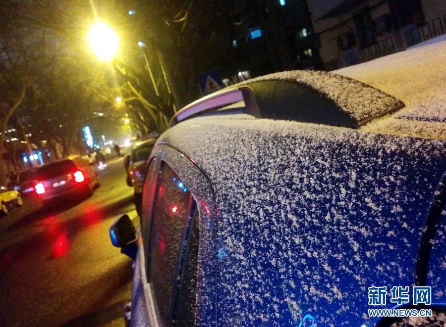 1月24日夜,停靠在北京街头的汽车车身上覆盖着薄薄的积雪(手机照片)。当日,一场降雪“光临”北京。北京市气象局官方微博“气象北京”发布消息称,16时前后开始,北京市自西向东先后出现小雪或零星小雪。截至20时,全市平均降雪0.3毫米。新华社记者 武巍 摄