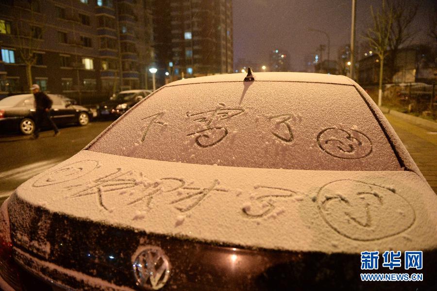 新华社照片,北京,2015年1月24日 雪花“光临”北京 1月24日晚,北京一小区内停放的车辆上覆盖着一层白雪,上面写着“下雪了”等字样。当日,一场降雪“光临”北京。北京市气象局官方微博“气象北京”发布消息称,16时前后开始,北京市自西向东先后出现小雪或零星小雪。截至20时,全市平均降雪0.3毫米。新华社记者 陈晔华 摄