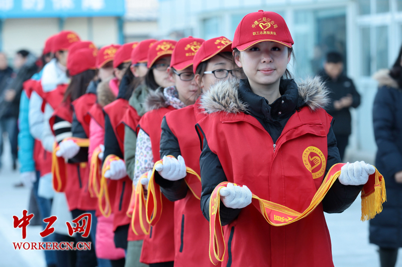 职工志愿服务队在寒风中整齐列队。 中工网记者 李雪峰 摄