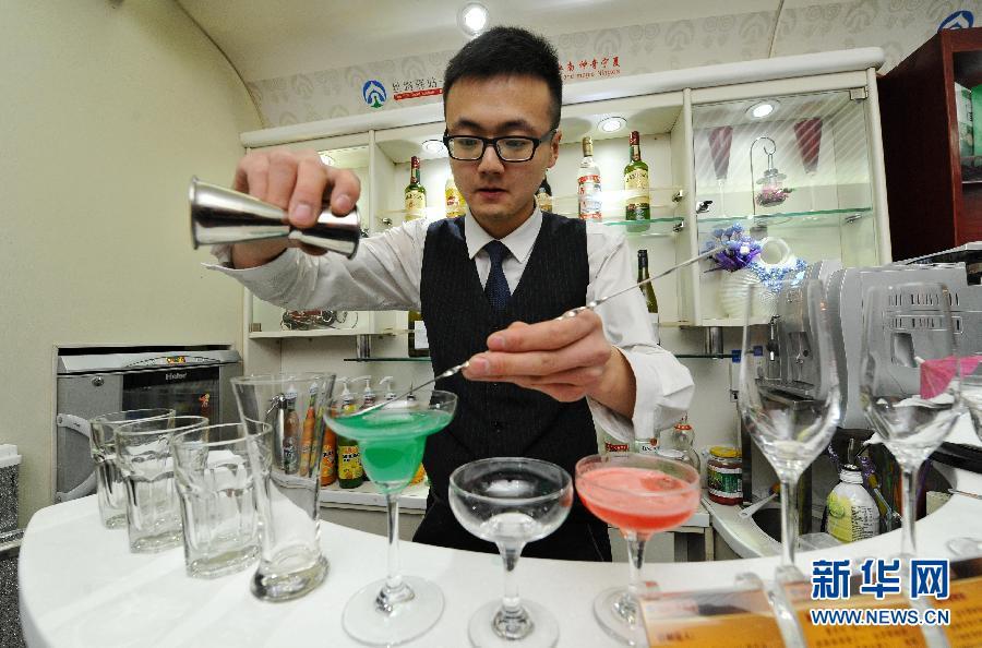 1月26日,兰州铁路局银川客运段的乘务人员在“丝路驿站——宁夏号”列车上为旅客调制鸡尾酒。