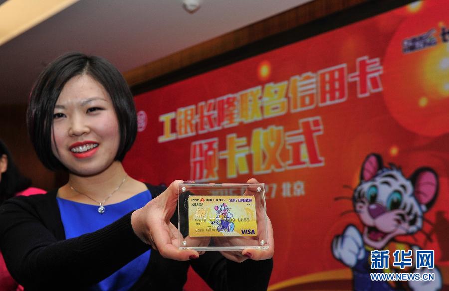 1月27日,客户代表在展示新发行的工银长隆联名信用卡。当日,中国工商银行与长隆集团在北京正式宣布联合发行工银长隆联名信用卡。该卡是国内第一款主题公园联名信用卡,包括银联品牌及VISA品牌芯片卡,支持接触式与非接触式使用。据悉,该卡在香港和澳门同步首发。新华社记者 杨光 摄