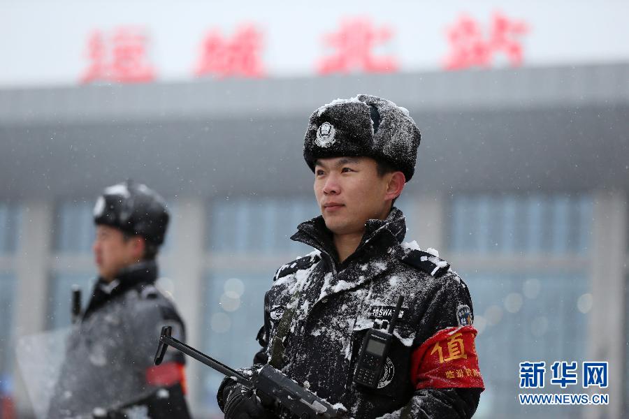 1月27日,铁路民警在风雪交加的山西运城北站巡逻值守。近日,我国中东部迎来今年以来范围最广、持续时间最长的雨雪天气,陕西、河南、湖北、安徽等多省有暴雪。 新华社发(鲍东升 摄)