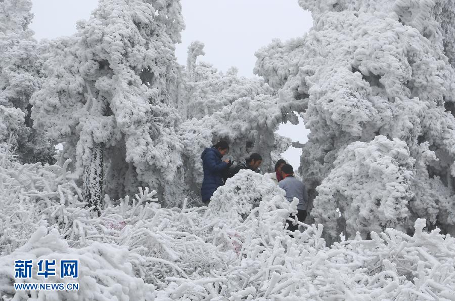 2月1日,游客在南岳衡山上游览。连日来,持续的冰冻天气让位于湖南衡阳的南岳衡山呈现银装素裹的北国风光,群山树木被冰雪覆盖,美不胜收。 新华社发(曹正平 摄)
