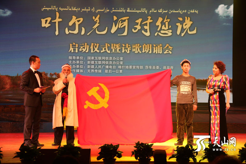 莎车县的两名共产党员,78岁的肉孜阿尤甫和18岁的麦麦提·尼孜牙持党旗上场。