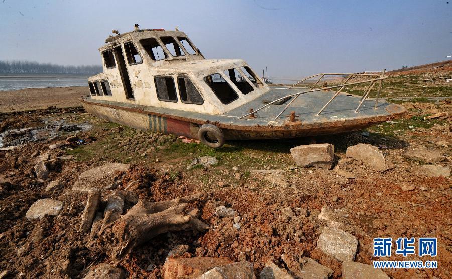这是湘江湘阴段航道沿岸因枯水裸露的河床以及搁浅的旧船只(2月11日摄)。 新华社记者 龙弘涛 摄 图片来源:新华网