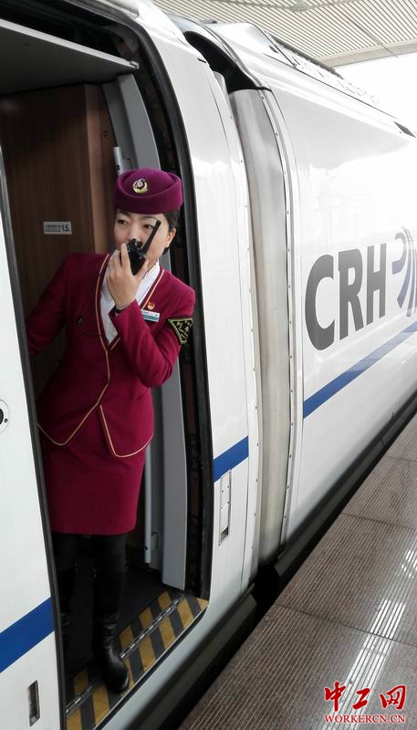 王娇珑说,在今年春运四十天里,她和班组一定要实现“安全出行、方便出行、温馨出行”的目标。并且为了保证顺利完成好春运任务,王娇珑带领班组召开春运动员大会,从安全、路风、服务三个方面入手,布置工作要点。进行应急演练,增强职工应急能力。图为动车即将开行,王娇珑正在进行安全确认。(王一 摄)