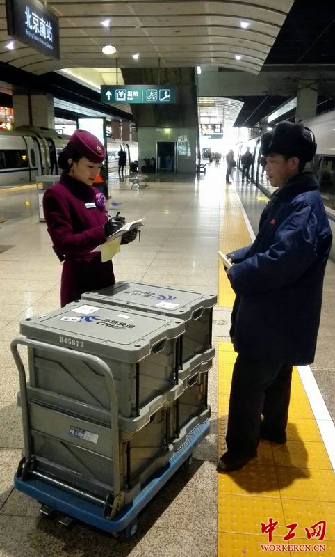 图为列车长王娇珑和车站交接高铁快件,认真核对件数、发到站签字确认。(王一 摄)
